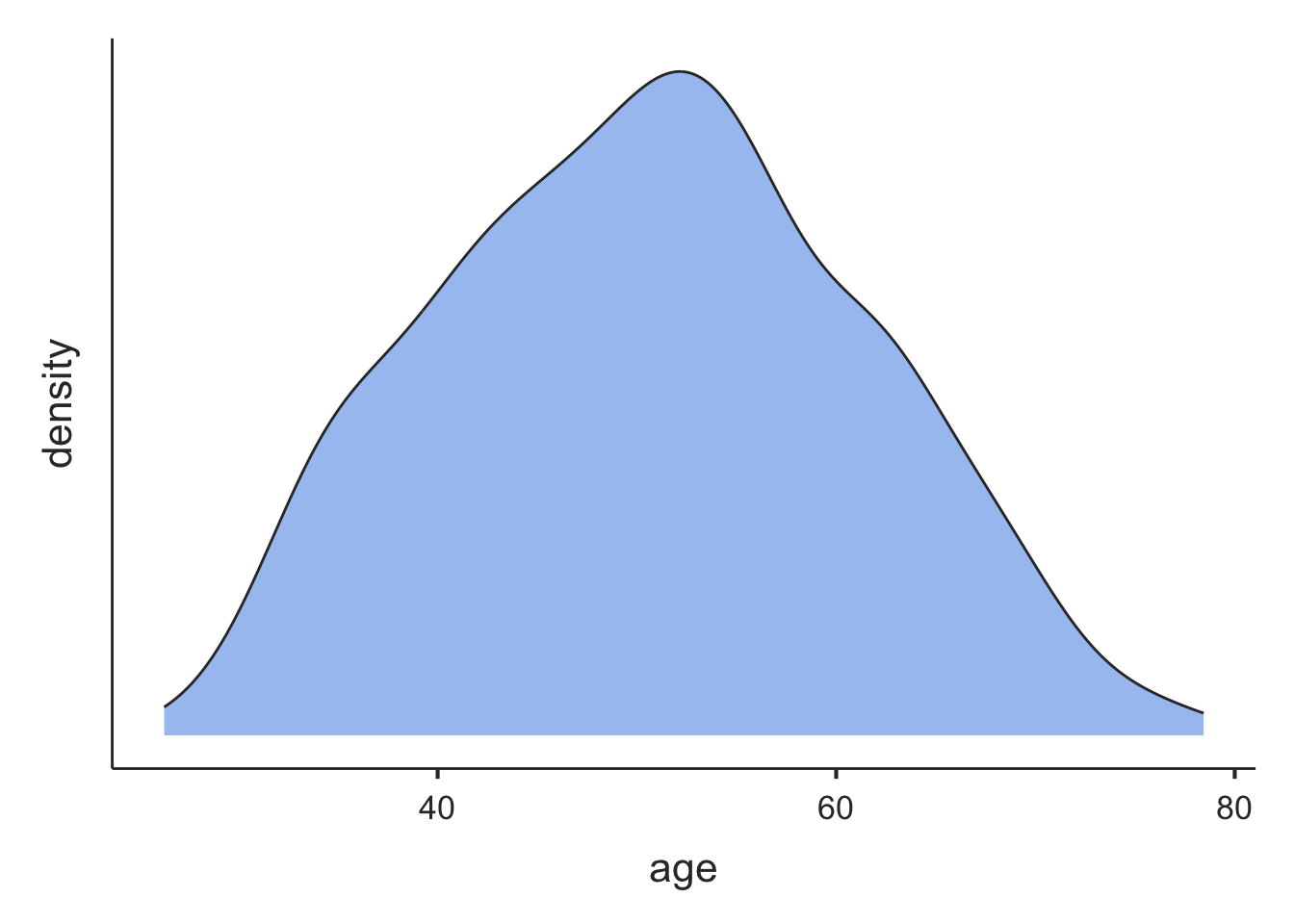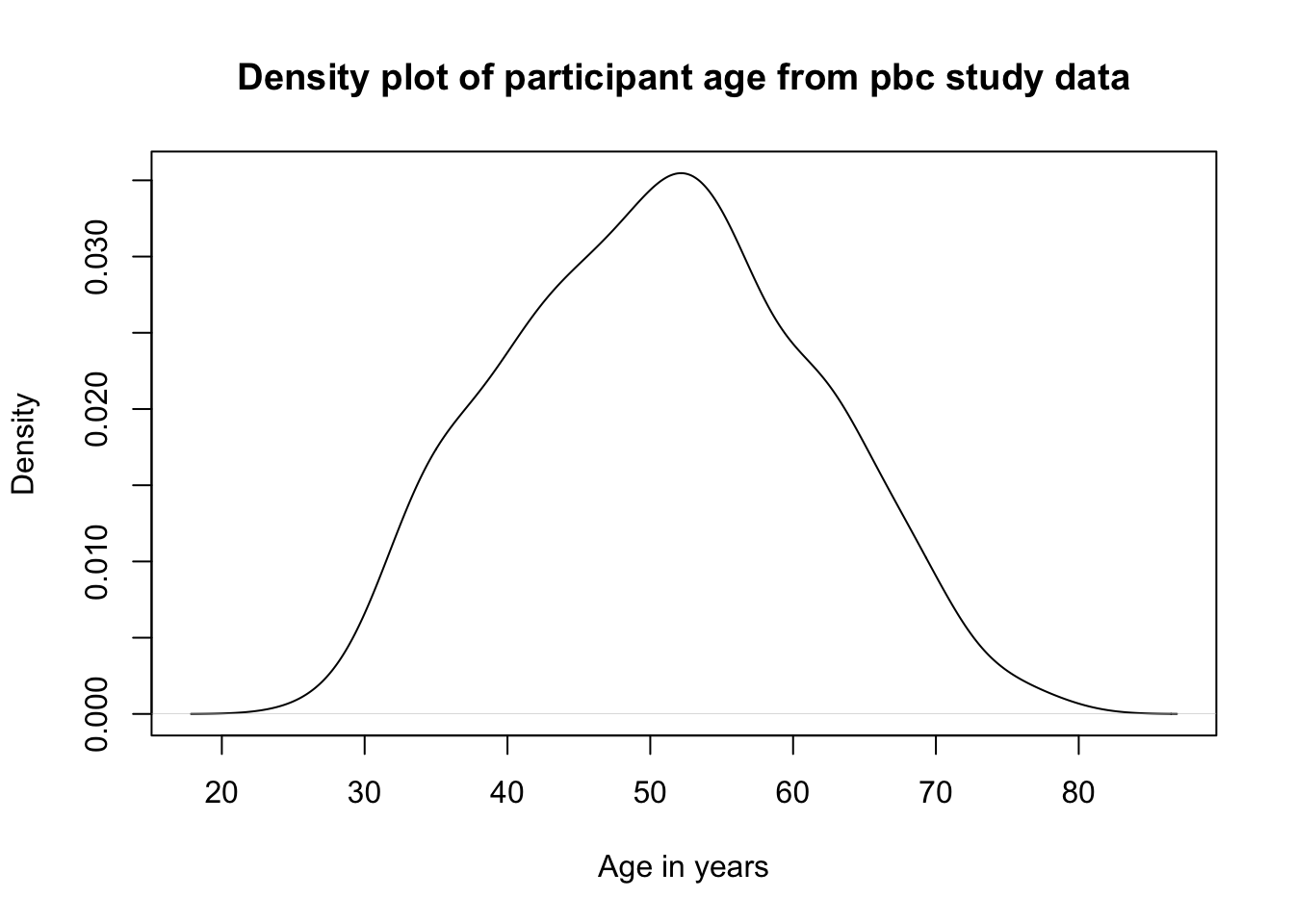 A more flexible way of constructing a density plot is by using the plot() function within R, using the syntax: plot(density(dataframe$variable)), which plots the variable from the dataframe. For example, the default density plot for the age column of the pbc data: