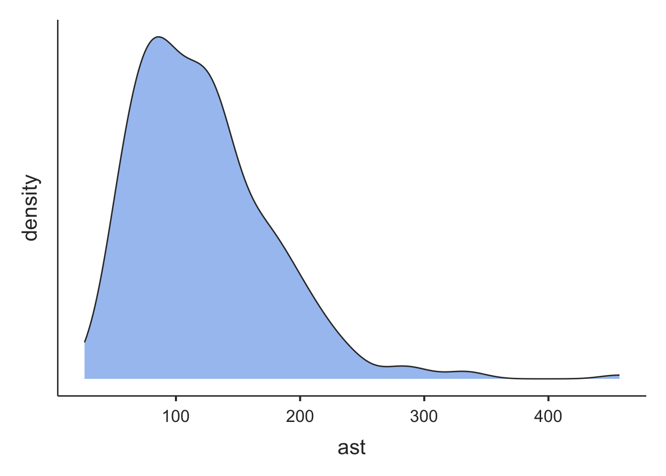 main="Density plot of aspartate aminotransferase from pbc study data")
