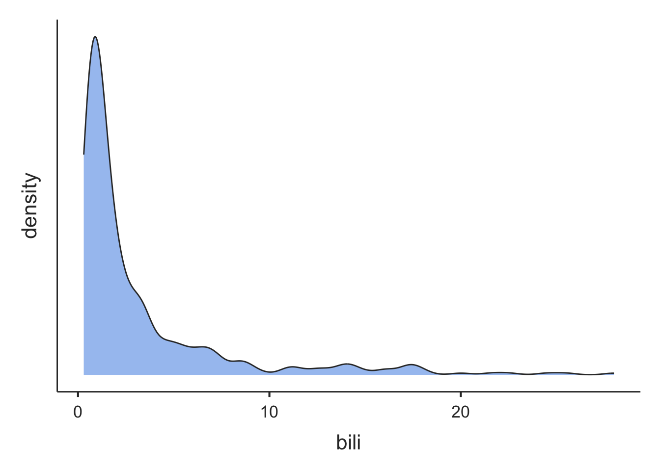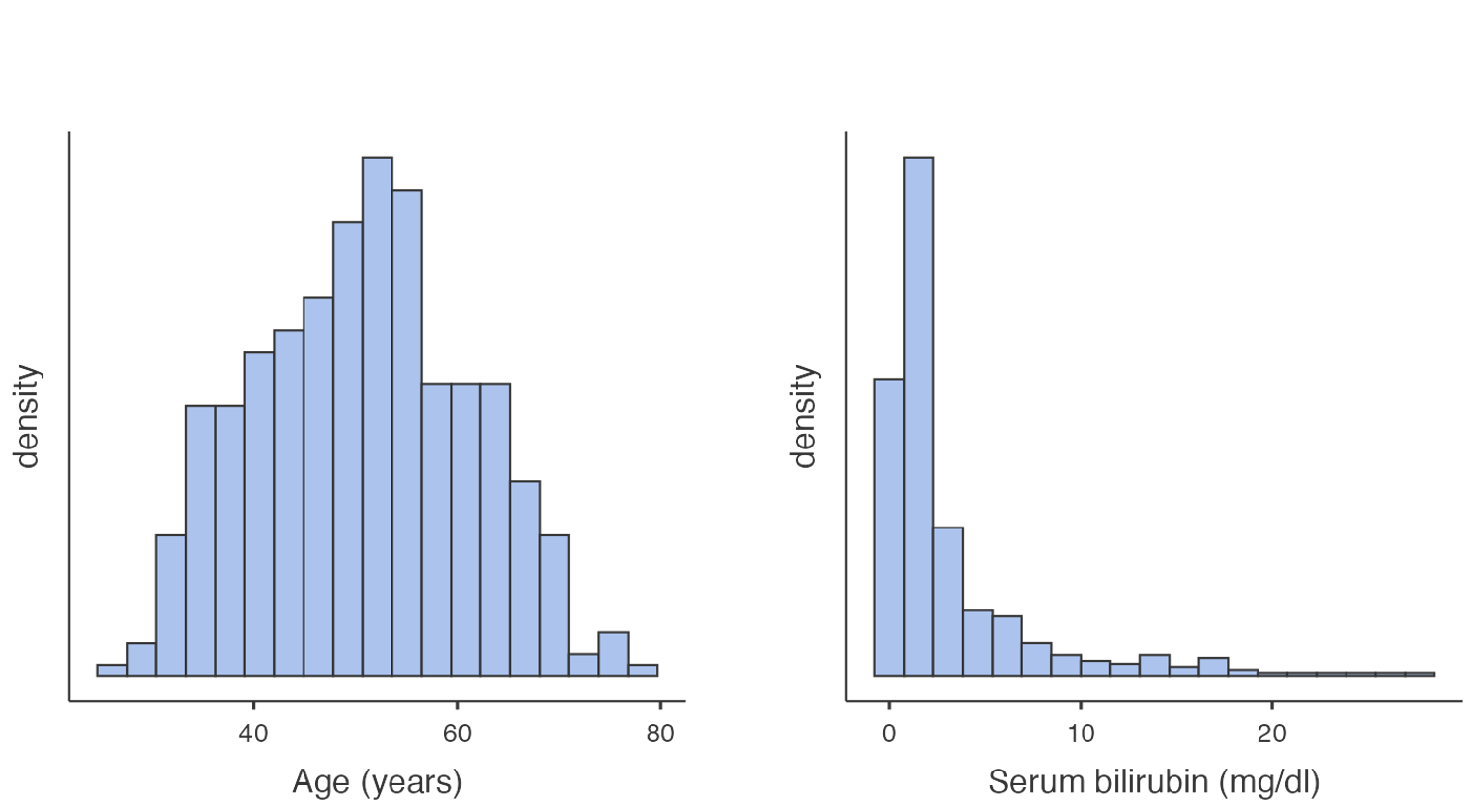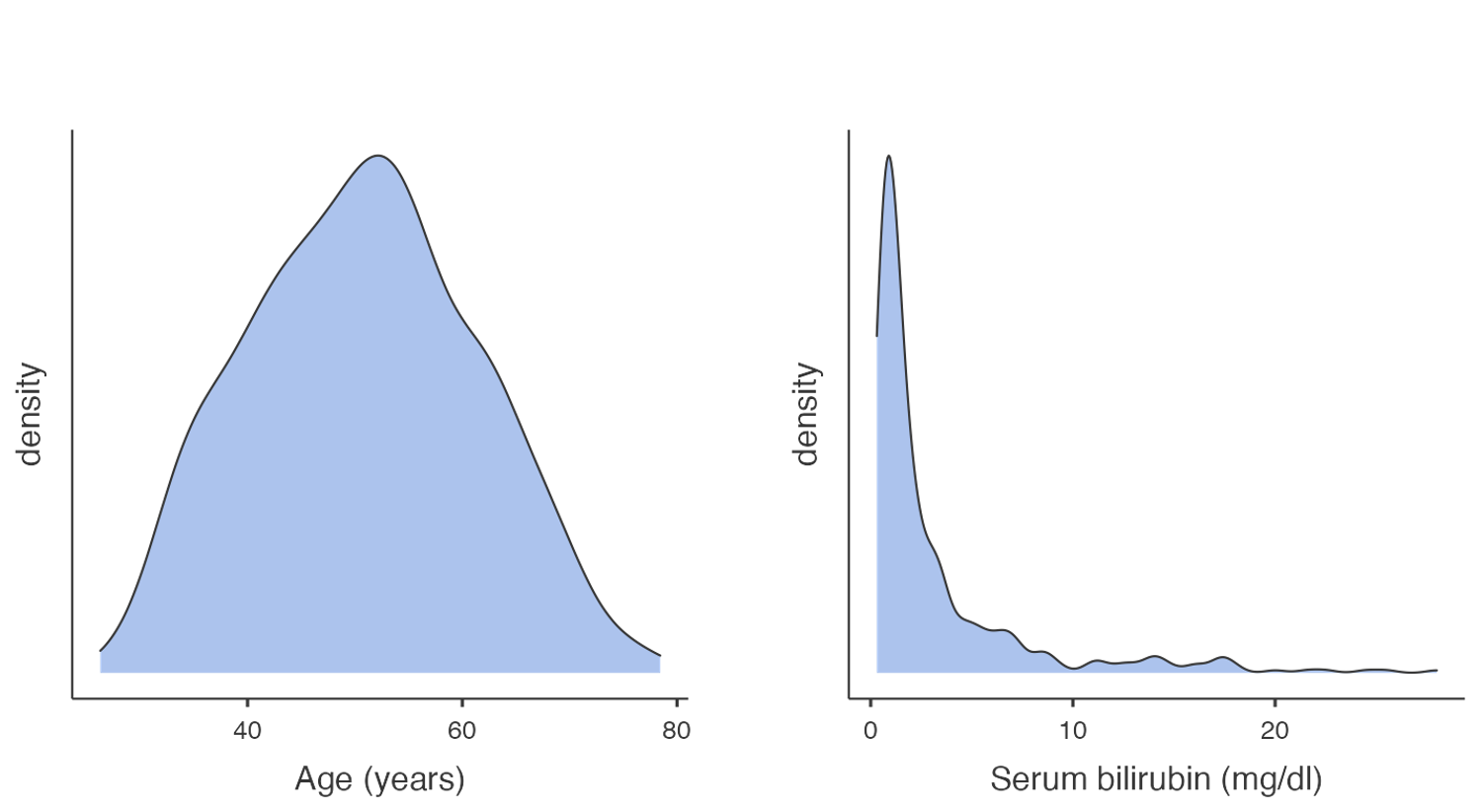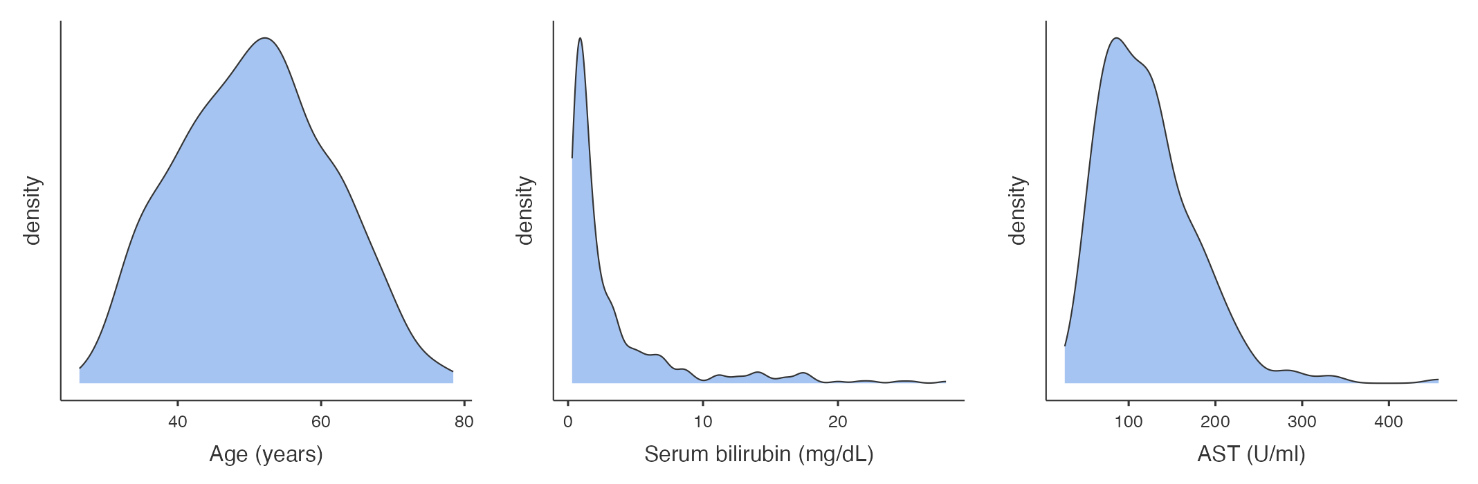 descriptives(data=pbc, vars=c(age, ast, bili), pc=TRUE, dens=TRUE)