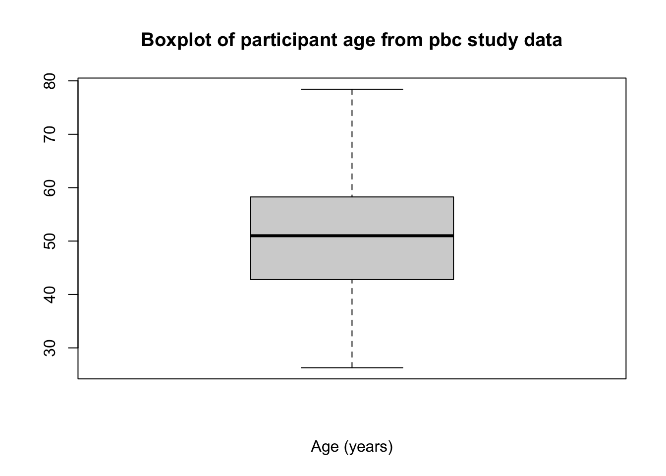 The boxplot function is an alternative, more flexible function, again specifying the dataframe to use and the variable to be plotted as dataframe$variable. Labels can be applied in the same way as the histogram: