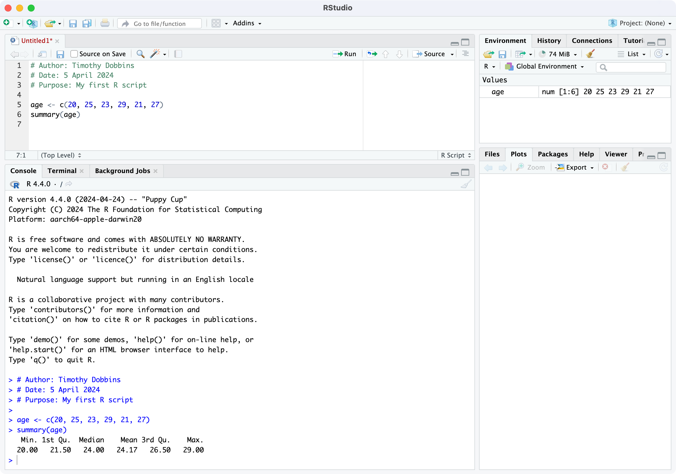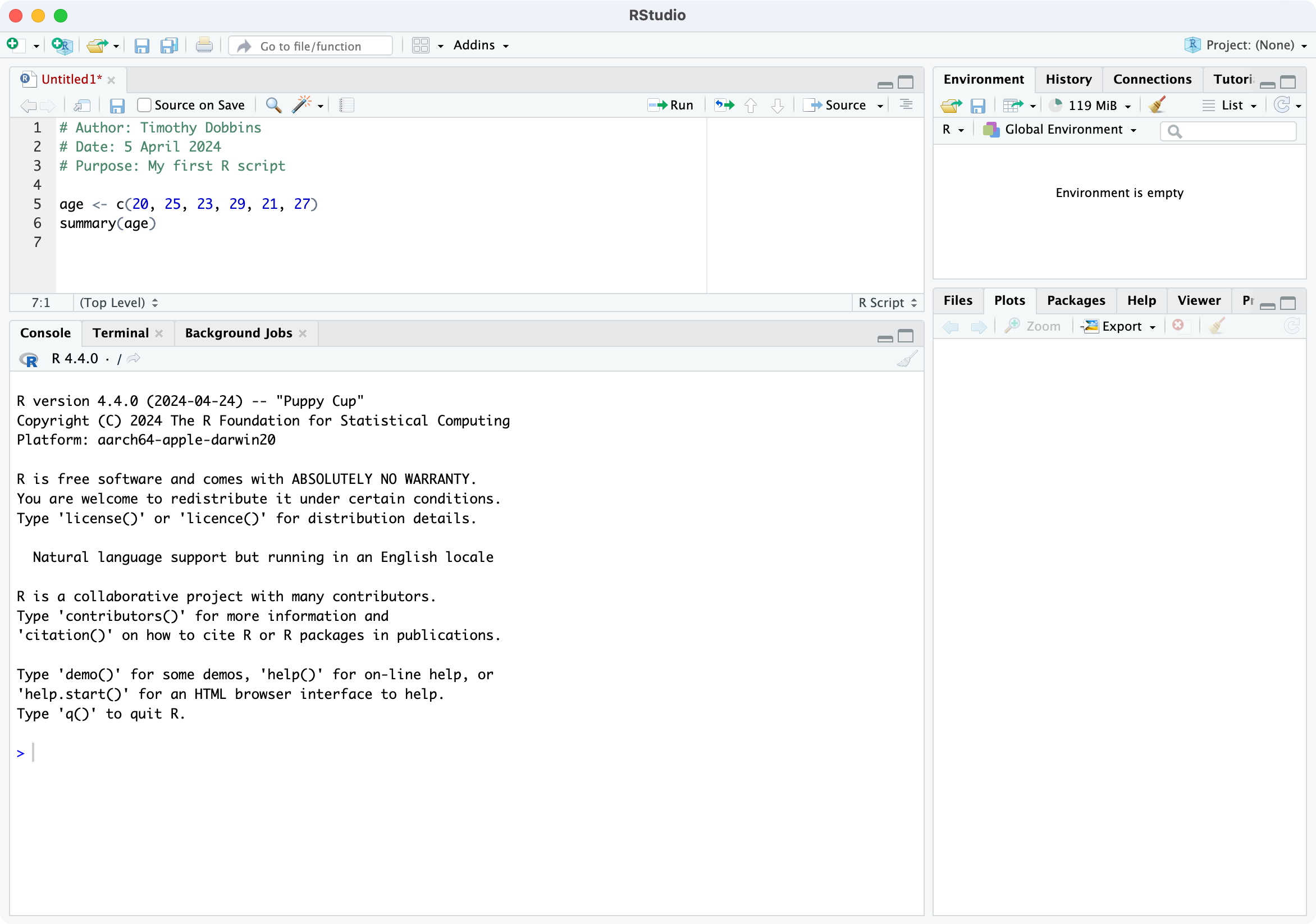 It is important to note that saving your data or your script in R will not save your output. The easiest way to retain the output of your analyses is to copy the output from the Console into a word processor package (e.g. Microsoft Word) before closing R.