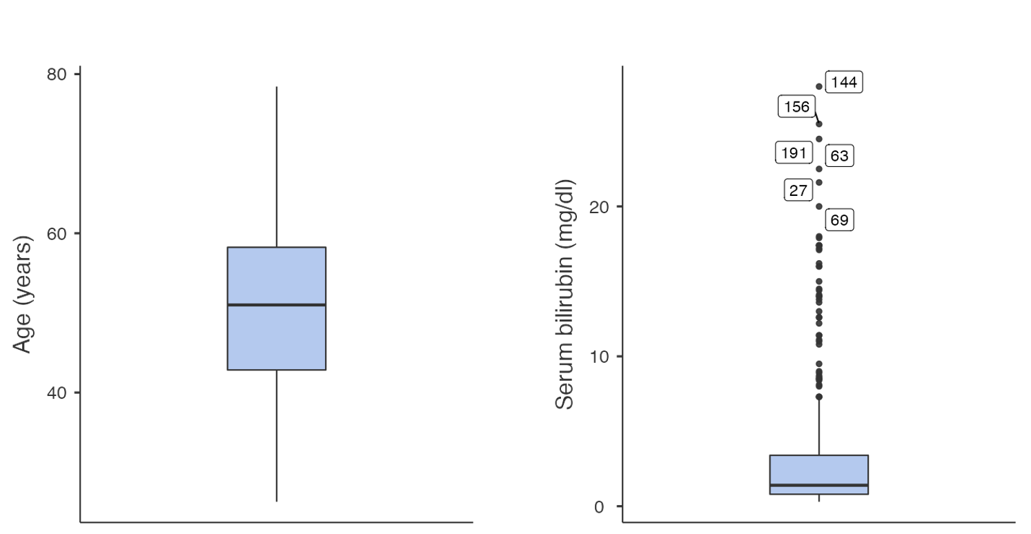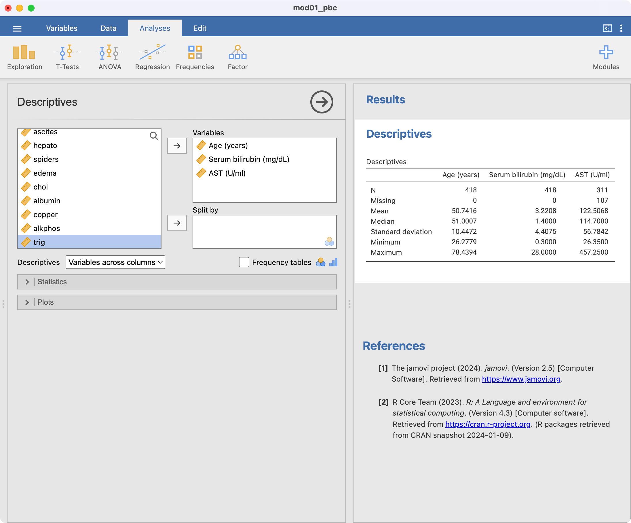 descriptives(data=pbc, vars=c(age, ast, bili), pc=TRUE)