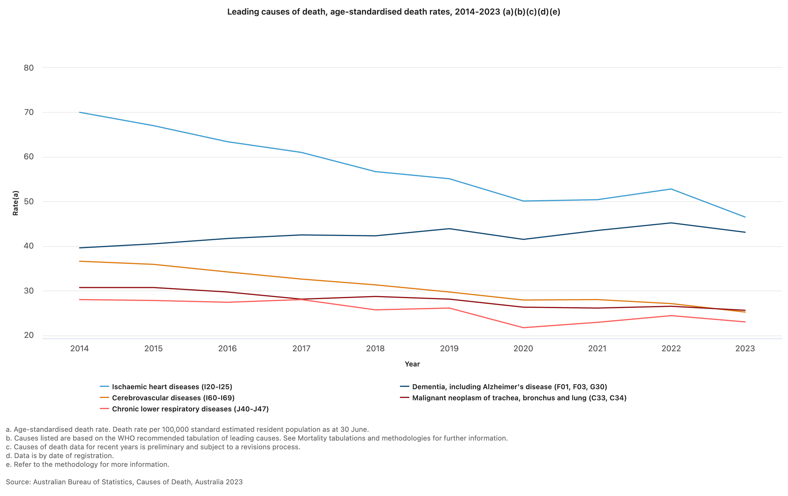 “The leading cause of death was ischaemic heart disease, accounting for 9.2% of deaths. The gap between ischaemic heart disease and dementia (the second leading cause of death) has continued to narrow over time, with only 237 deaths separating the top two leading causes in 2023.”