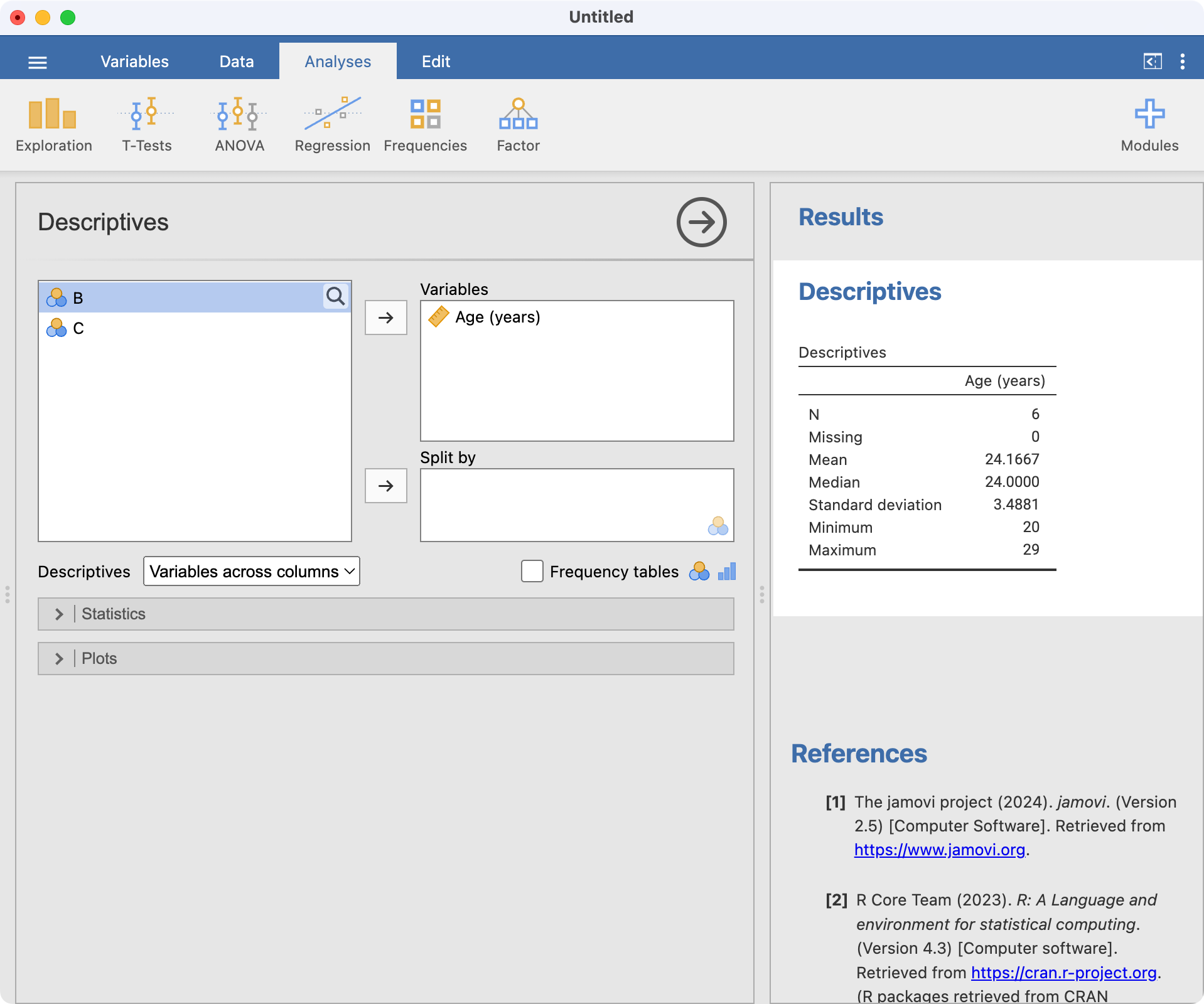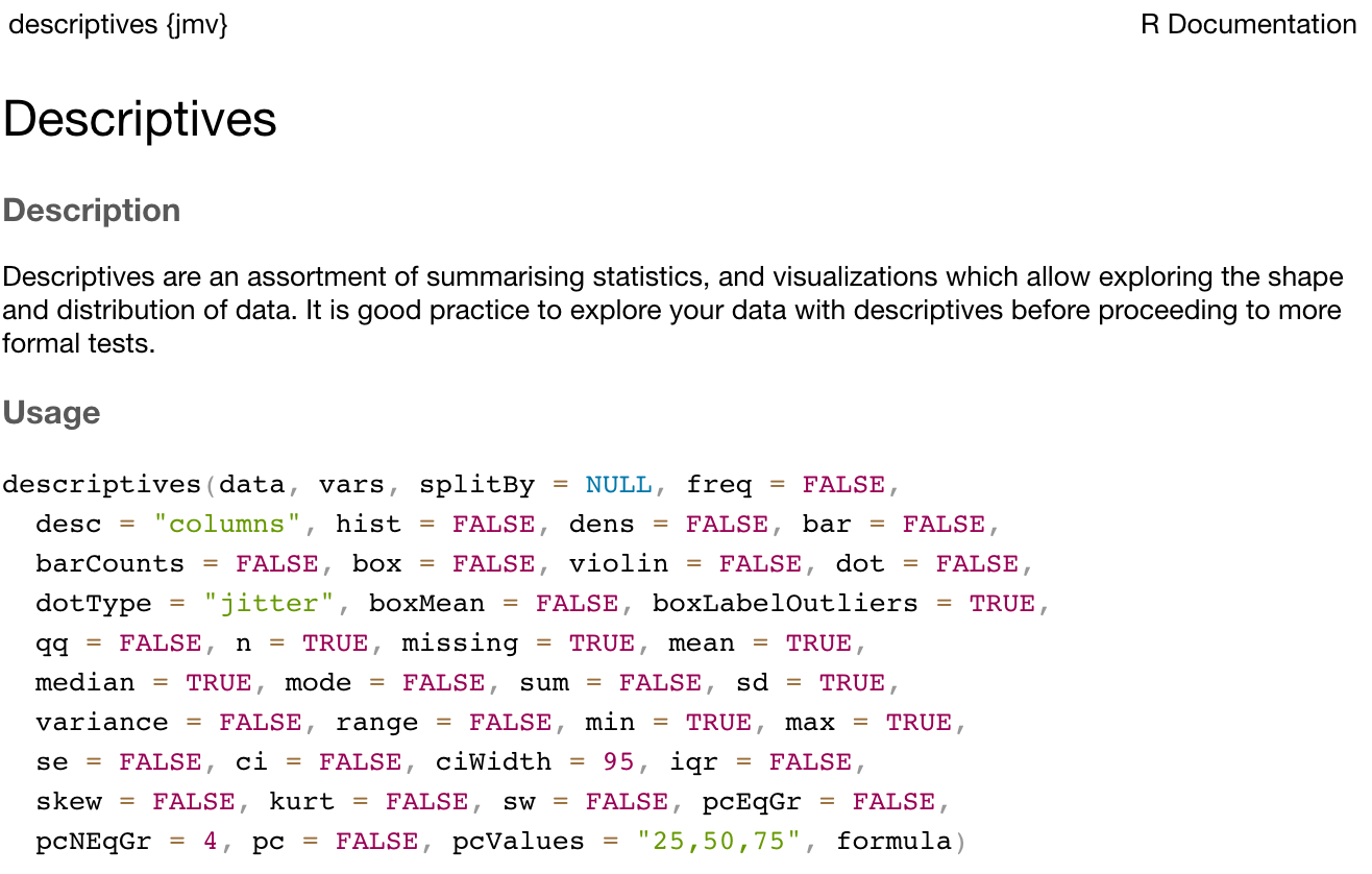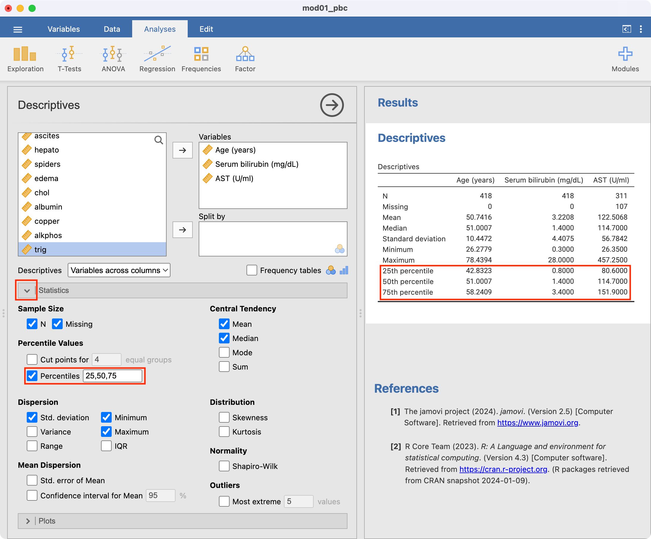 By default, the descriptives function presents the mean, median, standard deviation, minimum and maximum. We can request additional statistics, such as the quartiles (which are called the percentiles, or pc, in the descriptives function):