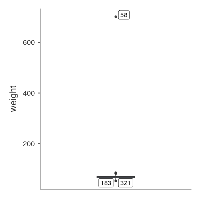 There is a clear outlying point shown in the boxplot. Although not obvious, the same point is shown in the density plot as a small blip around 700kg. Obviously this point is unusual, and we should investigate.