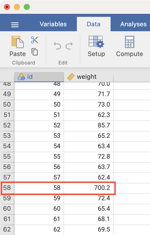 If you do not have access to the original data, it would be safest to set this value as missing. You do change this in R by using an ifelse statement to recode the incorrect weight of 700.2kg into a missing value. A missing value in R is represented by NA.