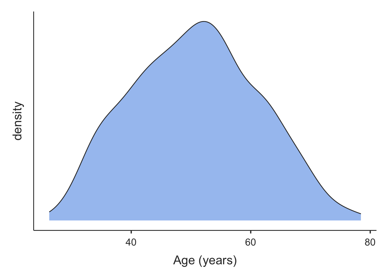 We can construct a density plot for age in the pbc data introduced in Module 1. We can see that the density plot is approximately approximately bell-shaped and roughly symmetrical. The mean (50.7 years) and median (51 years) are similar, as would be expected for a Normal distribution. Thus, it would be reasonable to assume that age is Normally distributed in this set of data.