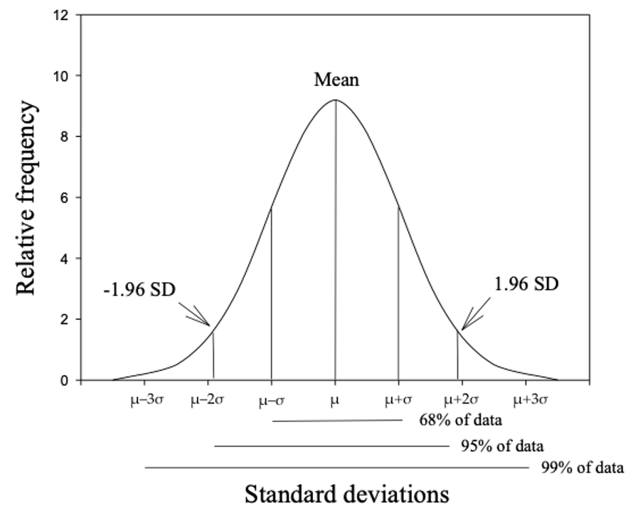For a Normal distribution, about 68% of the observations lie between \(- \sigma\) and \(\sigma\) of the mean; 95% of the observations lie between \(−1.96 \times \sigma\) and \(1.96 \times \sigma\) from the mean; and almost all the observations (99.7%) lie between \(-3 \times \sigma\) and \(3 \times \sigma\) (Figure 3.3). Also note that the mean is the same as the median, as the curve is symmetric about its mean.