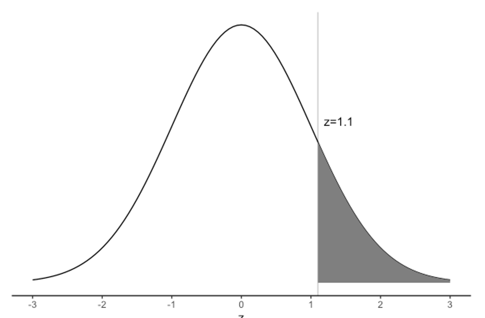 Figure 3.4 shows the probability of a diastolic blood pressure of 90 mmHg or more in the population for a z-score of greater than 1.1 on a Standard Normal distribution.
