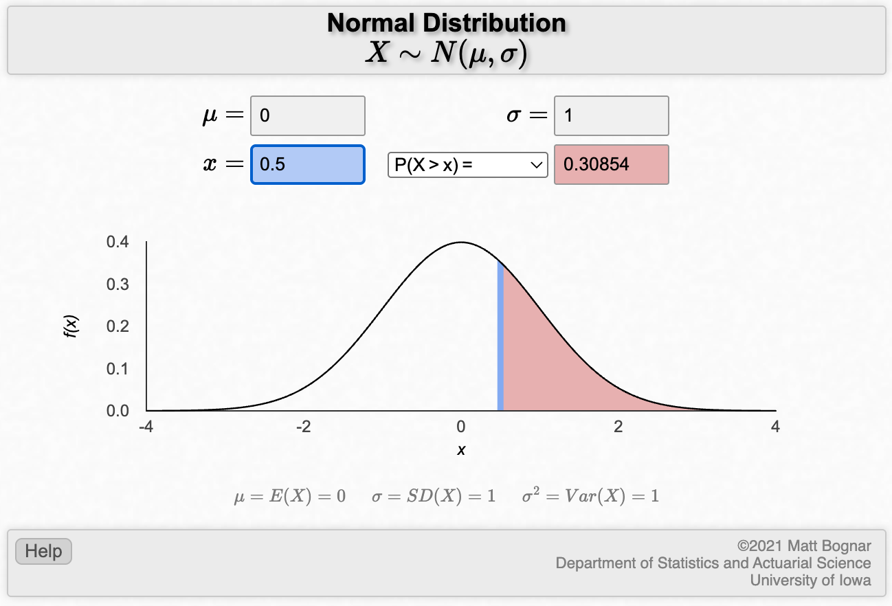 To obtain the probability of obtaining 0.5 or greater from a standard normal distribution:
