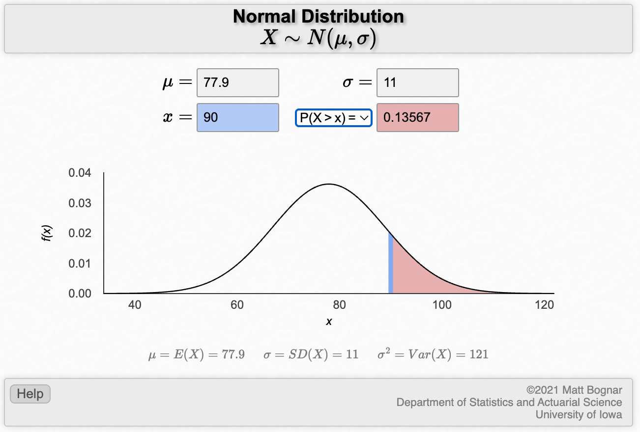pnorm(90, mean = 77.9, sd = 11, lower.tail = FALSE)[1] 0.1356661