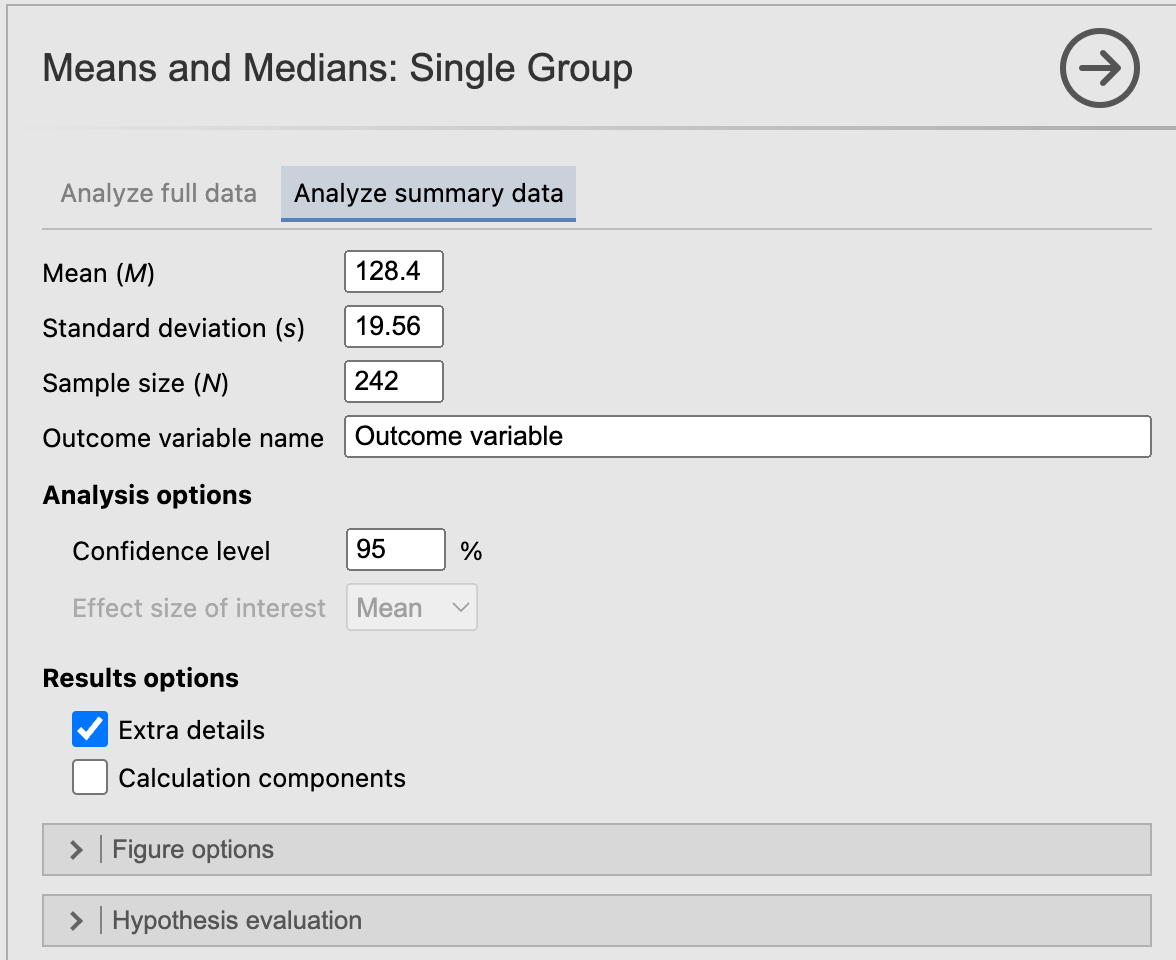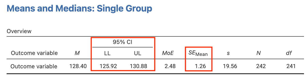 ci_mean(n=242, mean=128.4, sd=19.56, width=0.95)[1] "95% CI: 125.923 to 130.877"