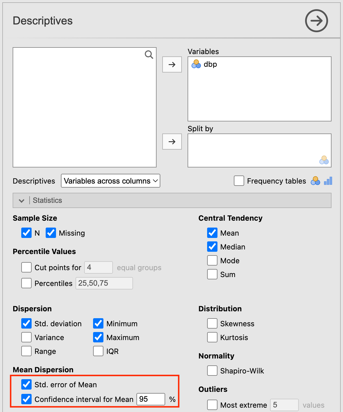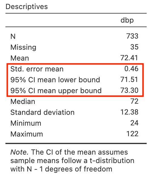 - Use jamovi or R to obtain an estimate of the mean, standard error of the mean and the 95% confidence interval for the mean diastolic blood pressure.
