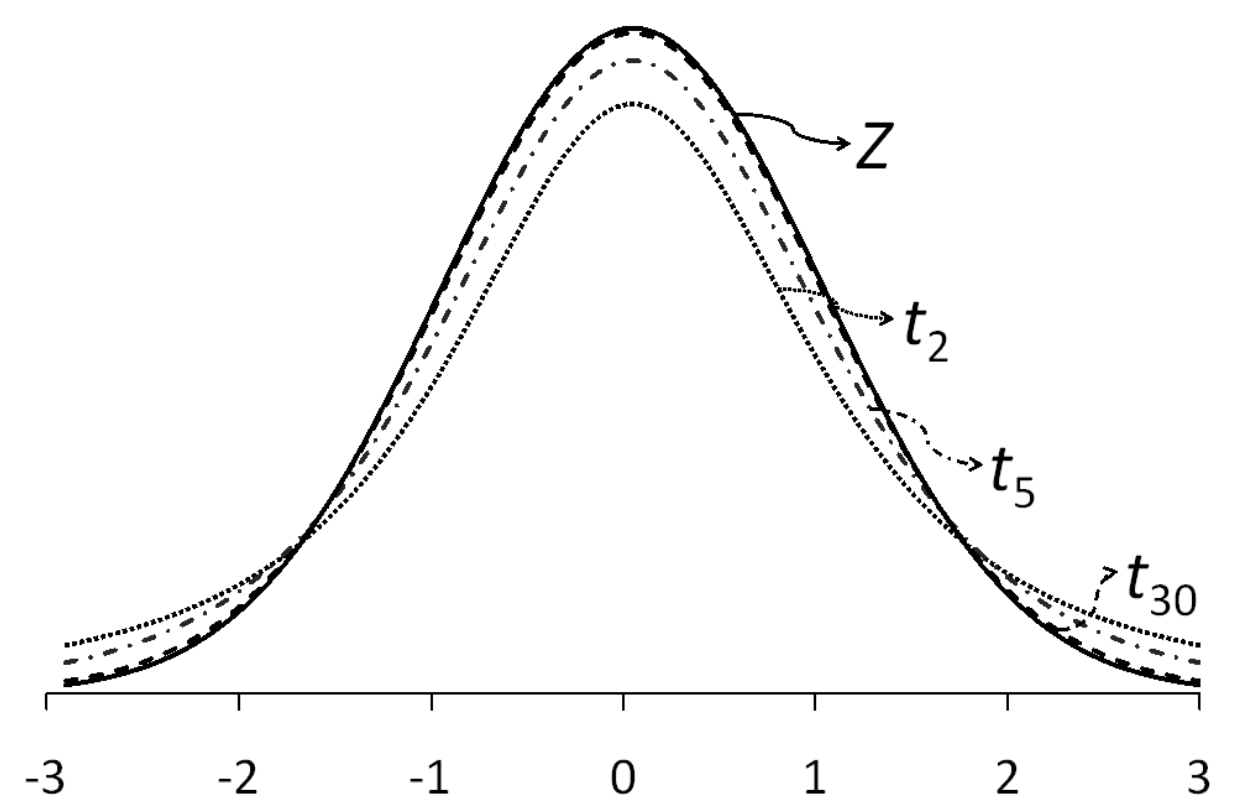 A t-distribution is used when the population standard deviation is not known. The t-distribution is appropriate for small samples (<30) and its distribution is bell shaped similar to a Normal distribution but slightly flatter. The t-distribution is useful for comparing mean values. See Module 4 and Module 5.