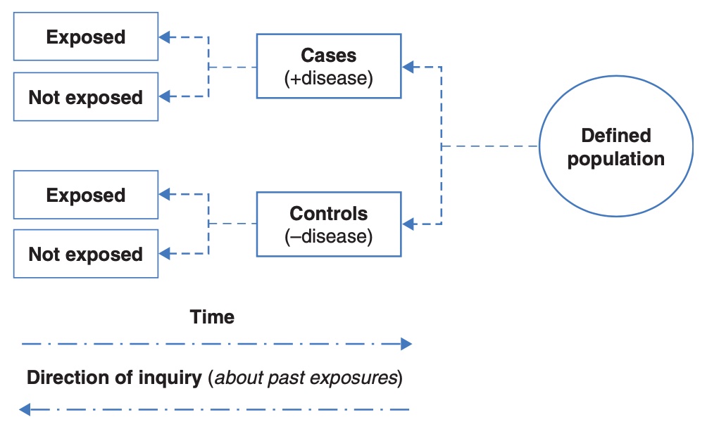While the randomised controlled trial and cohort study begin with a population without the outcome, a case-control study begins by assembling a group with the outcome of interest (cases), and a group without the outcome of interest (controls). The researchers then ask the cases and controls about their previous exposures.