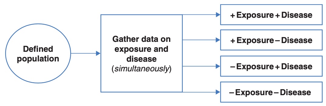 In a cross-sectional study, the exposure and the outcome are measured at the same time. While this results in a study that is relatively quick to conduct, it does not allow for any temporal relationships to be assessed.