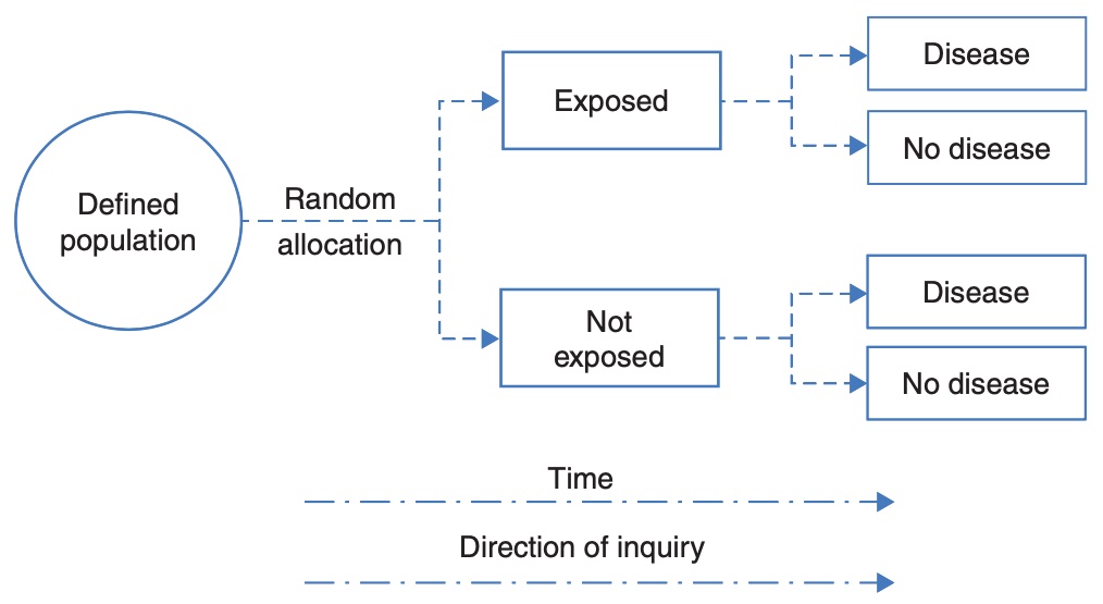 A cohort study is an observational study that addresses the research question: what is the effect of an exposure on an outcome. This research question is similar to that studied in a randomised controlled trial, but the exposure is defined by the participants’ circumstances, and not manipulated by the researchers. In a cohort study, participants without the outcome of interest are enrolled, followed over time, and information on their exposure to a factor is measured (either at baseline or over time). At the conclusion of the study, information on the outcome is measured to identify new (incident) cases.