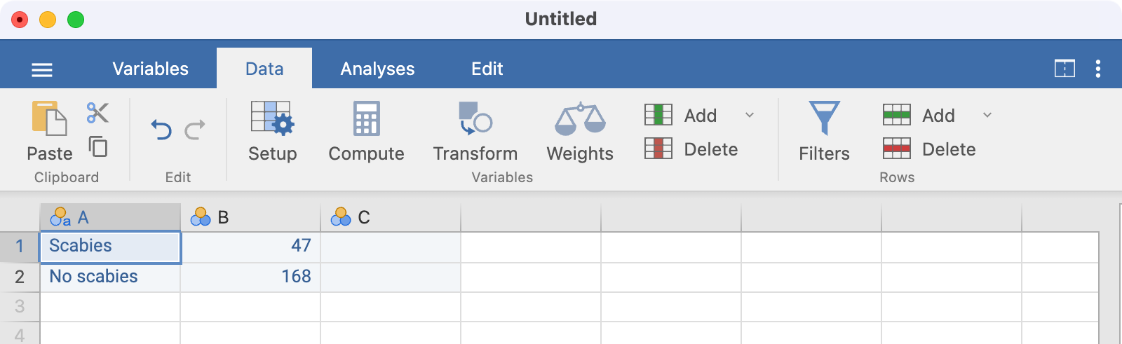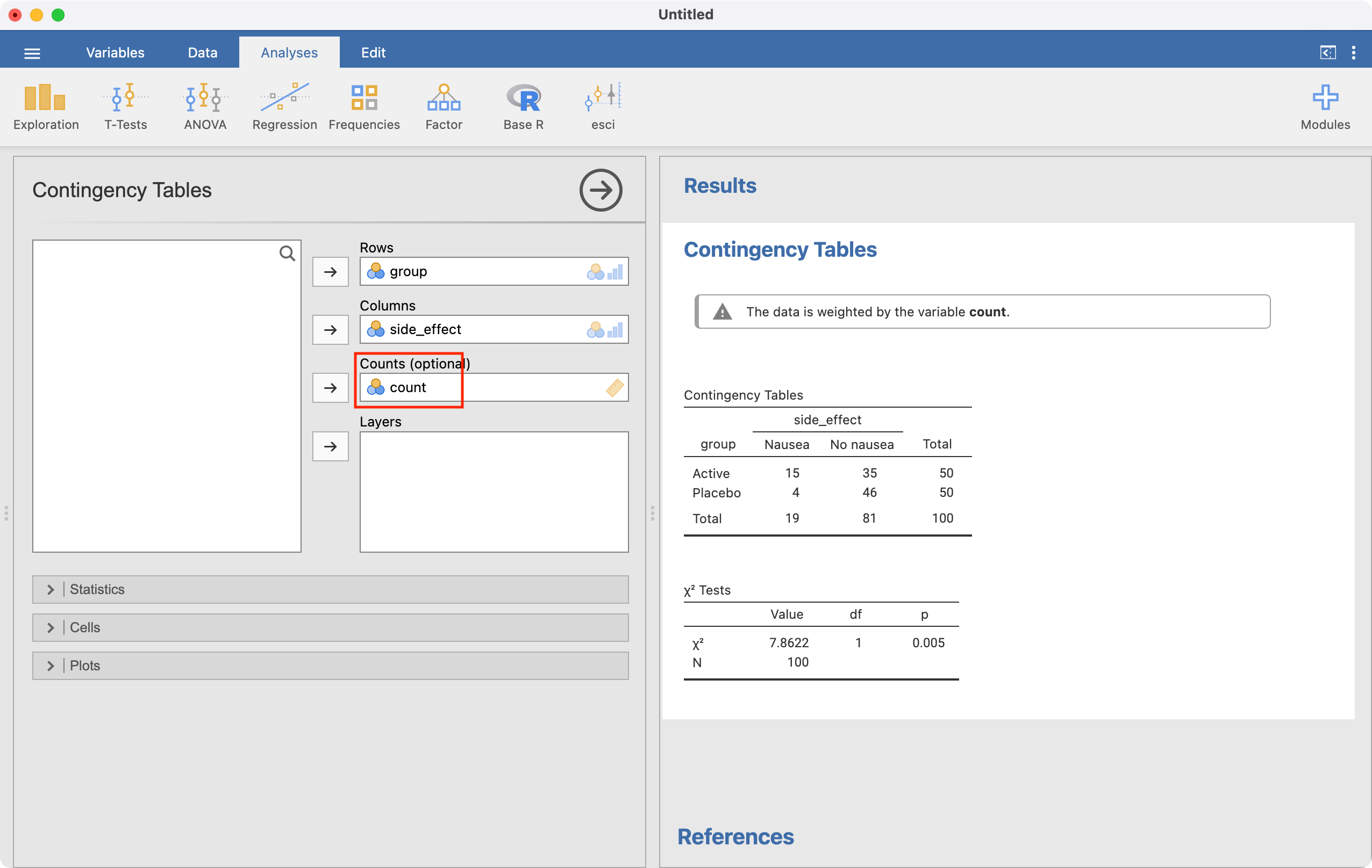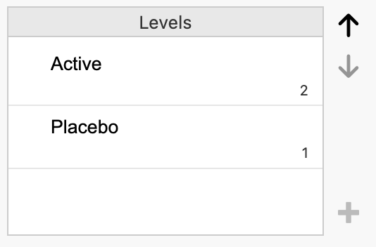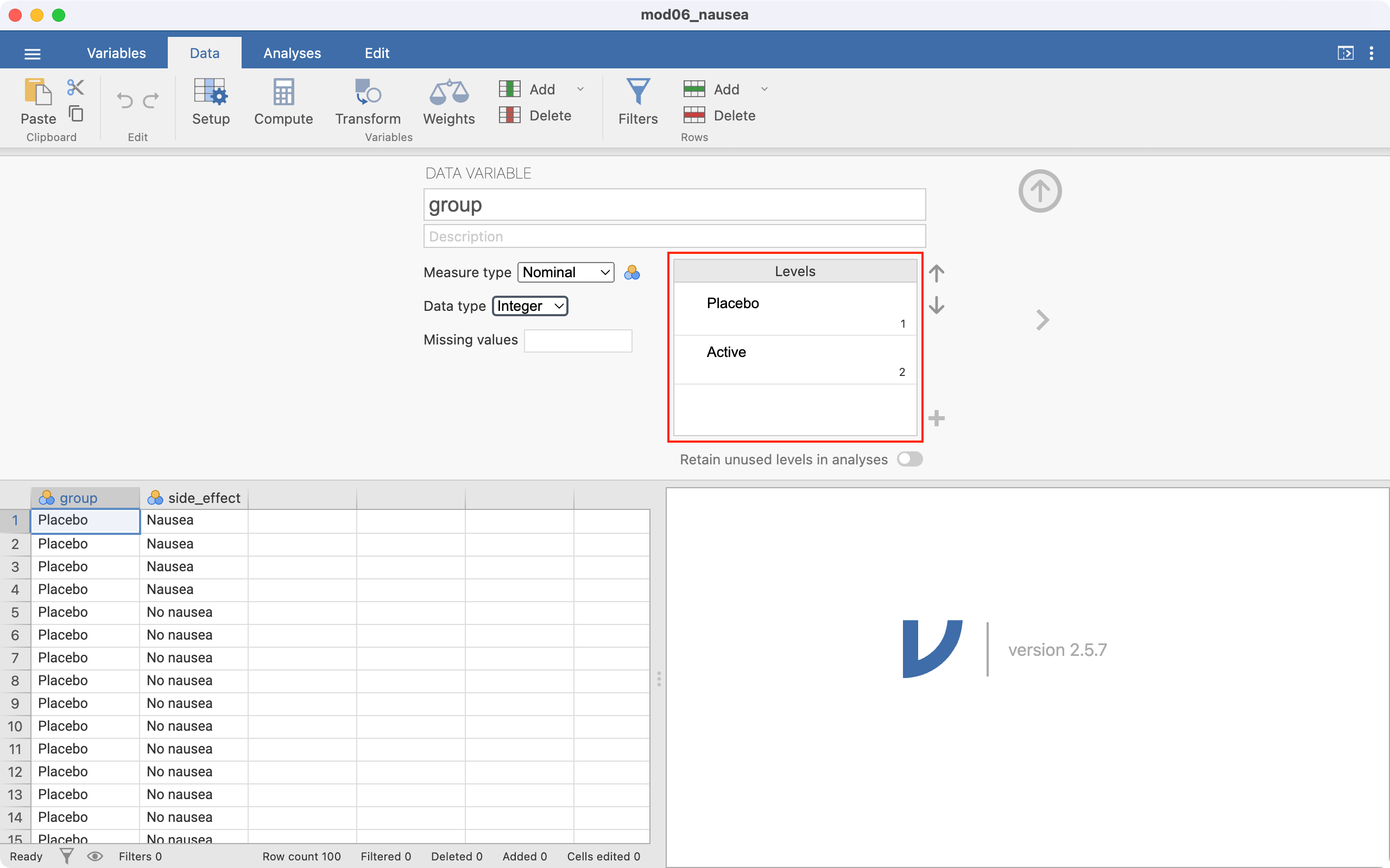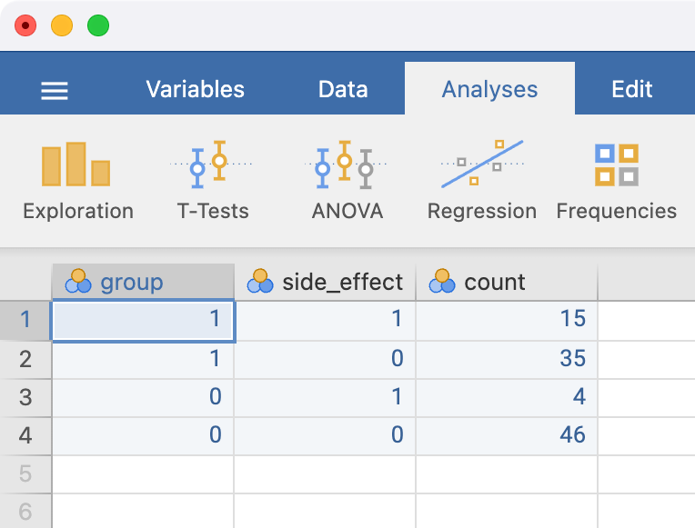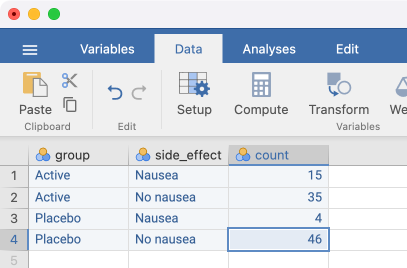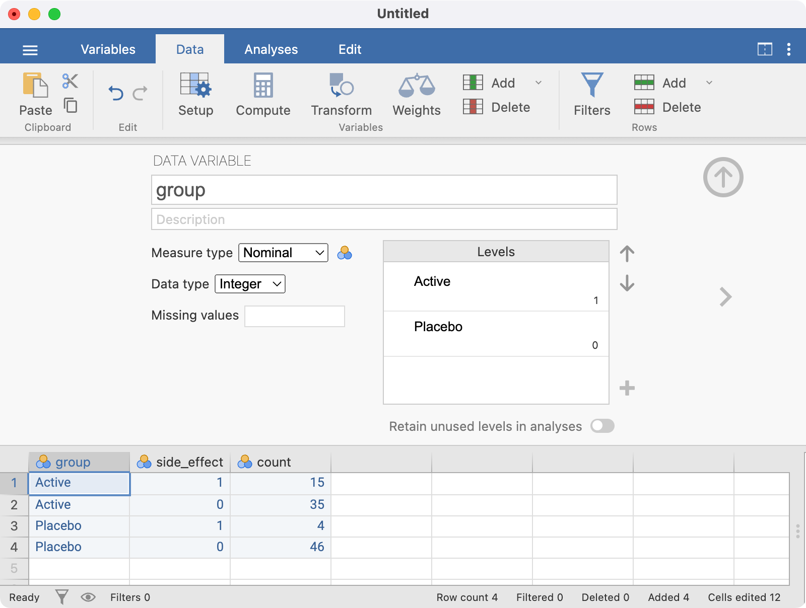 )We need to define group and side_effect as factors. Here we must define the levels in the order we want the categories to appear in the table. Note that as group and side_effect are entered as text variables, we can omit labels command when defining the factors, and the factor will be labelled using the text entry: