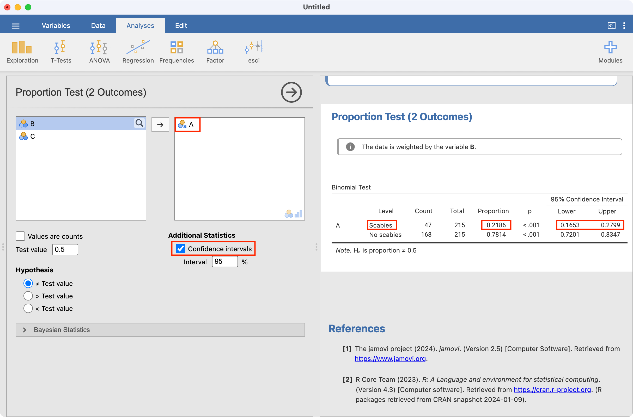 A paper by Brown, Cai and DasGupta (Brown, Cai, and DasGupta (2001)) has compared the properties of the Wald and Wilson methods (among others) and concluded that the Wilson method is preferred over the Wald method. Therefore, we recommend the Wilson method be used to calculate 95% confidence intervals for a proportion. Note that it is not possible to compute a Wilson confidence interval using jamovi. The interval calculated by jamovi is the Clopper-Pearson interval.
