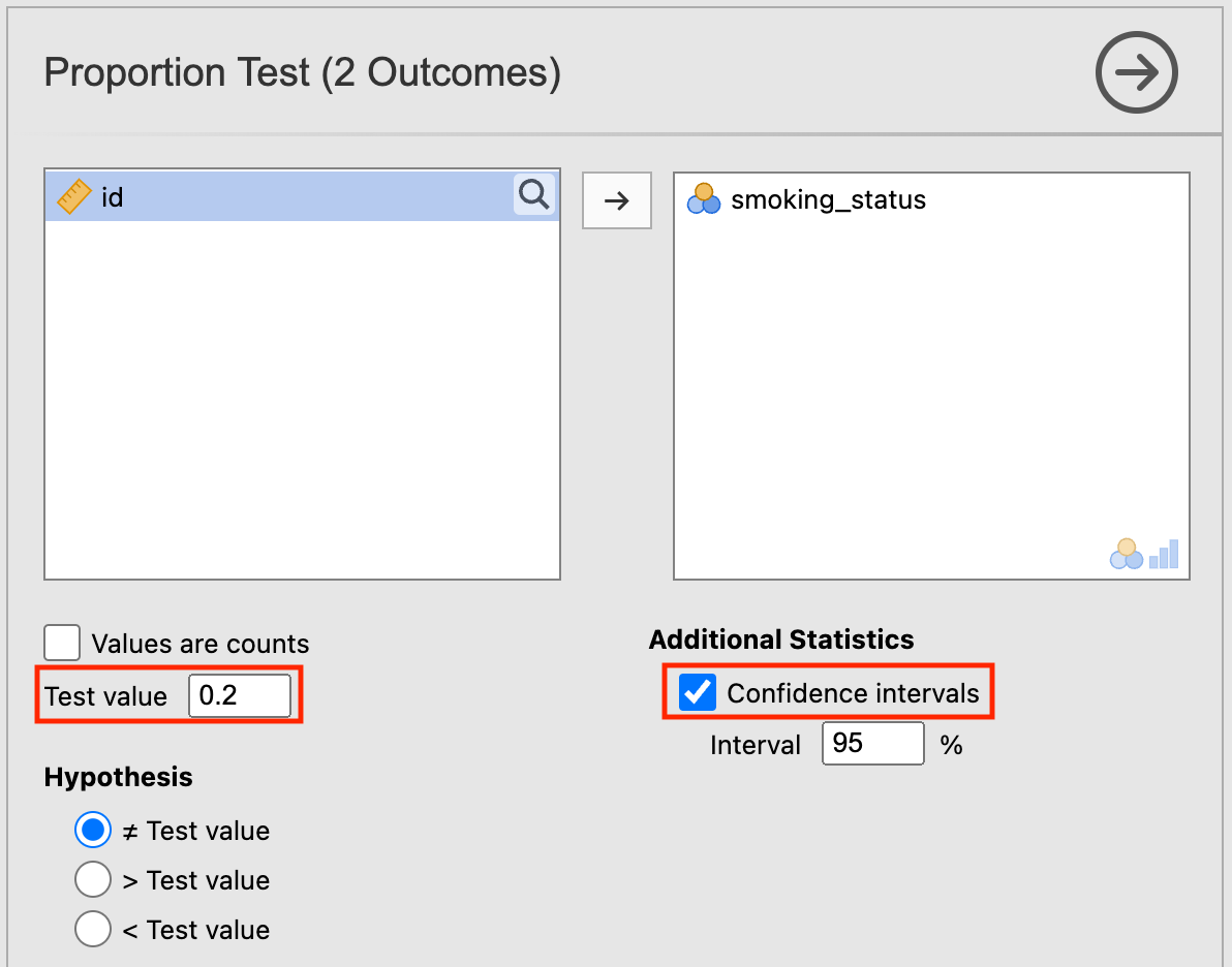 The file mod06_smoking_status.rds contains the data for this example. In the data file, smokers are coded as 1 and non-smokers are coded as 0. In jamovi, we can perform the binomial test, while in R, we can use the prop.test function to perform a z-test, or the binom.test function to perform the binomial test.