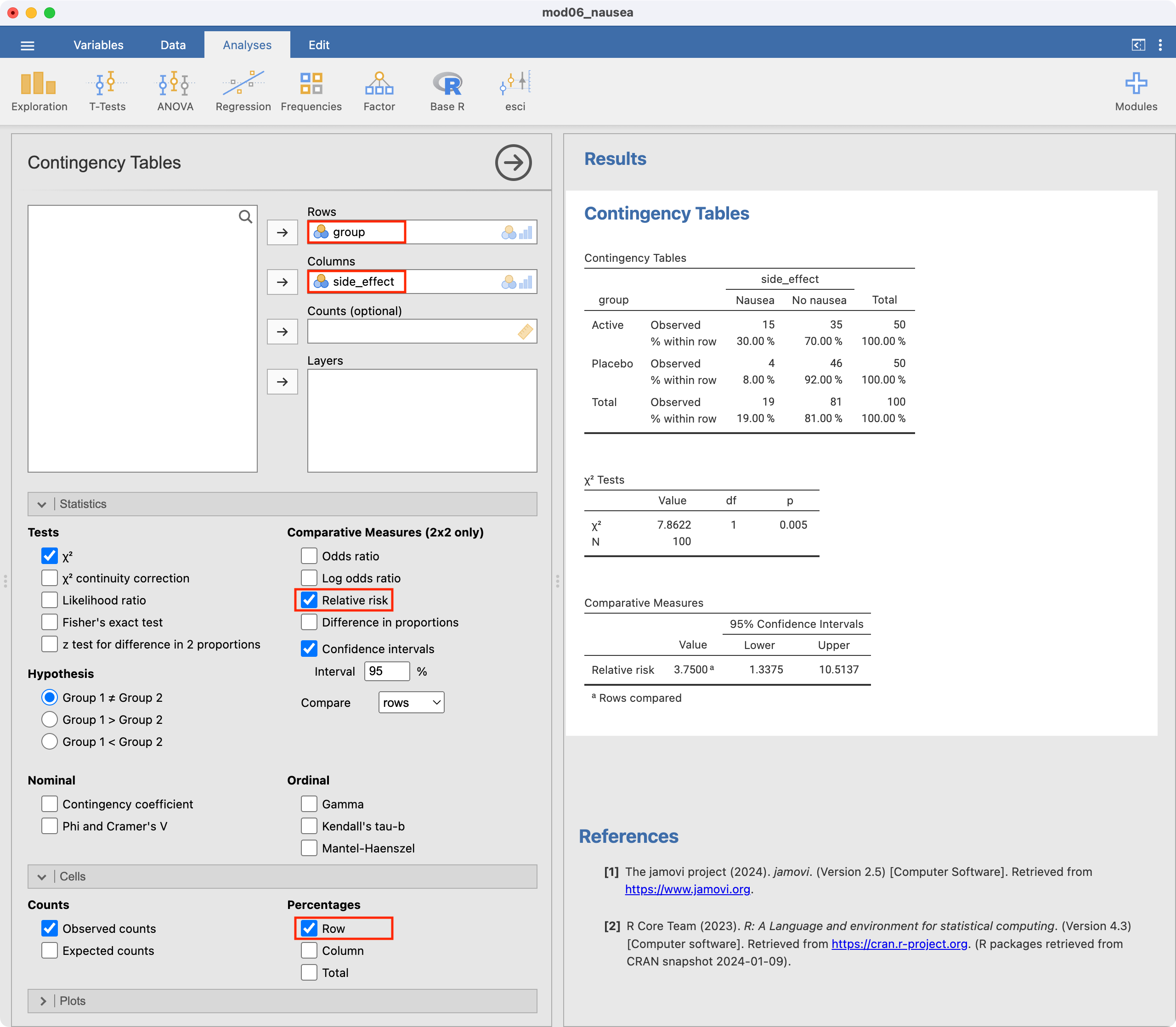 We can use jamovi or R to calculate the relative risk (RR=3.75) and its 95% confidence interval (1.34 to 10.51). This tells us that nausea is 3.75 times more likely to occur in the active drug group compared with the placebo group. Because this is a randomised controlled trial, the relative risk would be an appropriate measure of association.