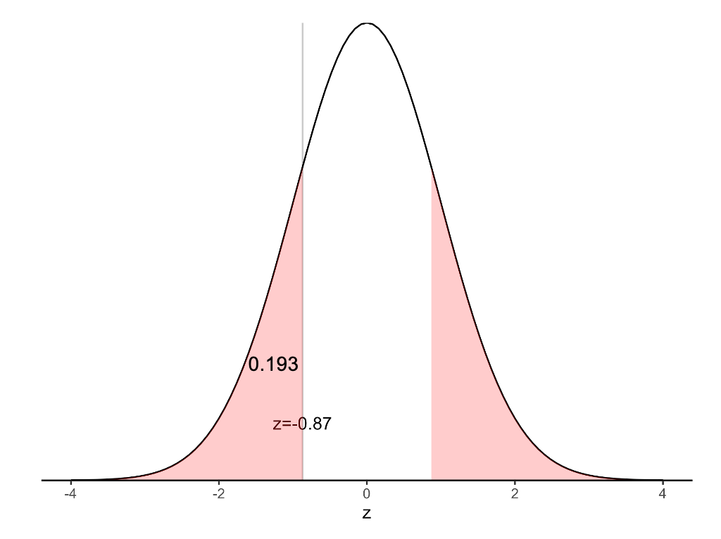 \[ \begin{aligned} z &= \frac{(0.18 - 0.20)}{\sqrt{\frac{0.20 × (1 - 0.20)}{300}}} \\ &= -0.87 \end{aligned} \]