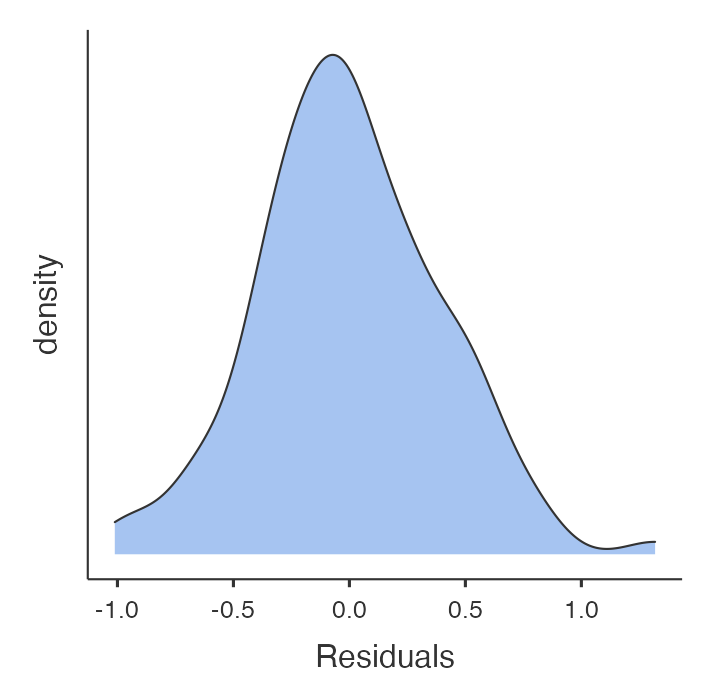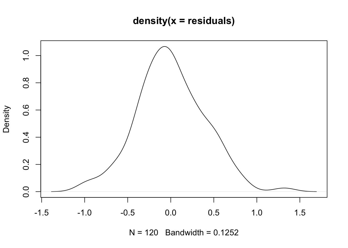 We can use the resid function to obtain the residuals from a saved model. These residuals can then be plotted using a density plot in the usual way: