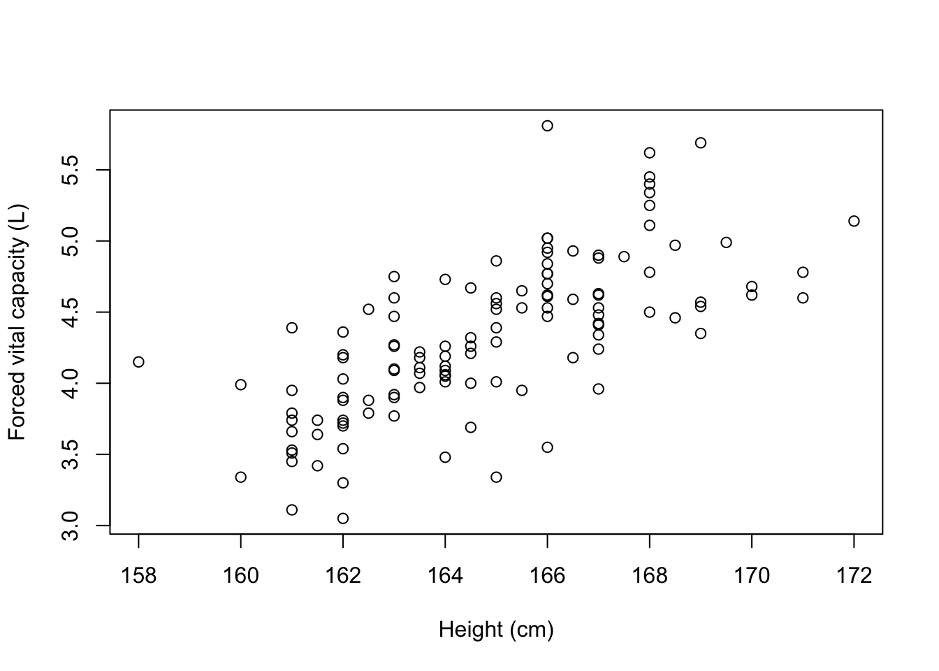 We can use the plot function to create a scatter plot to explore the association between height and FVC, assigning meaningful labels with the xlab and ylab commands: