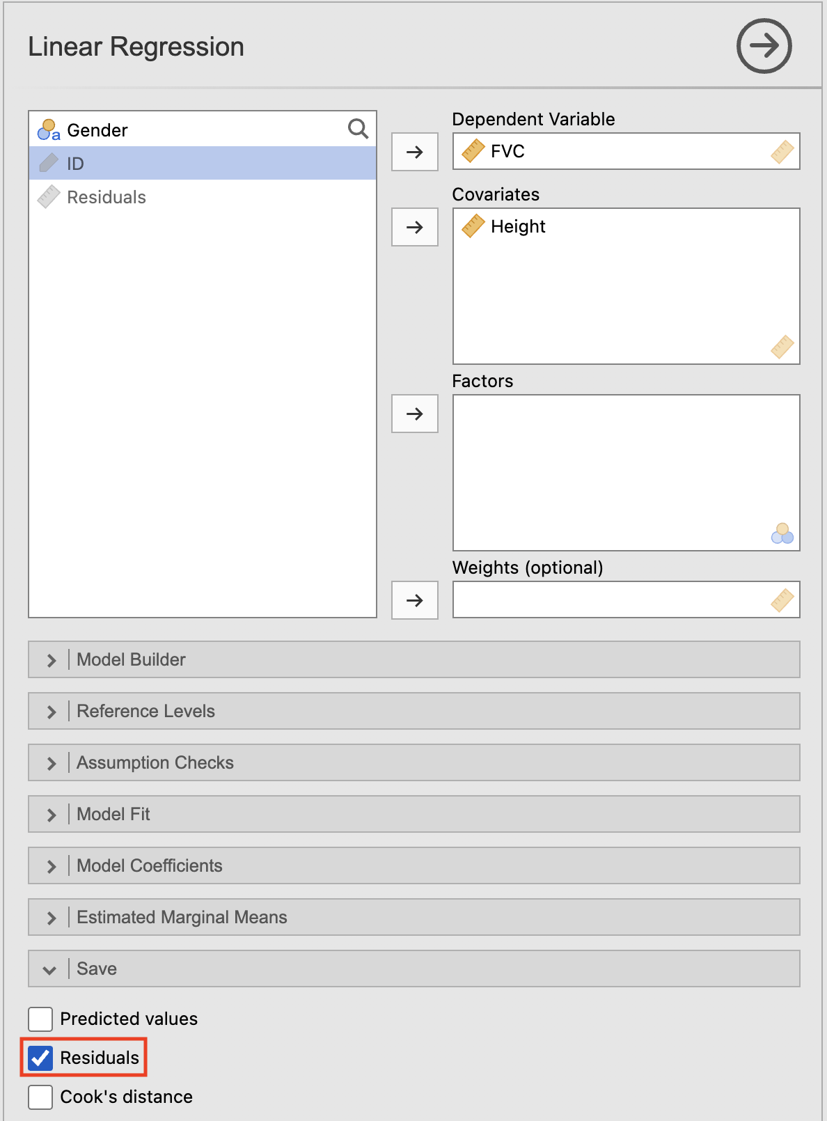 To plot the residuals, we first need to save them using the Save option within the Linear Regression command box: