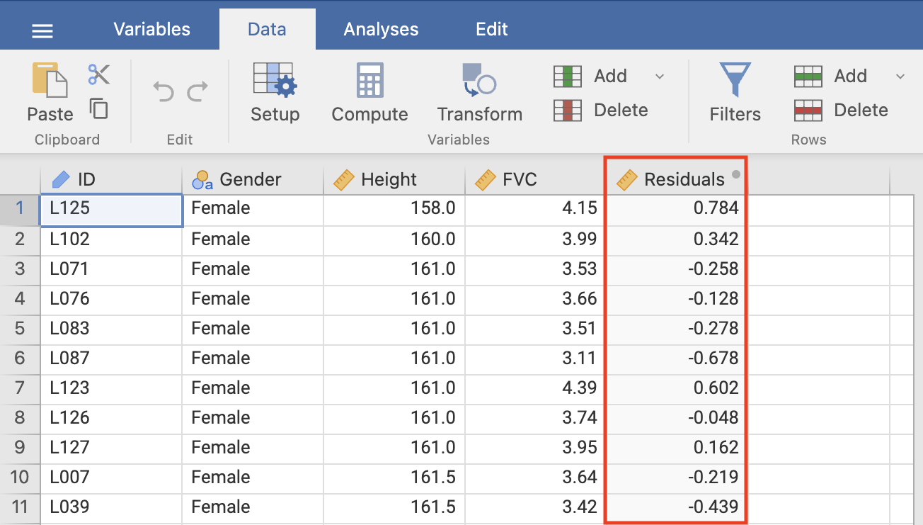 Figure 8.1 shows that as height increases, lung function also increases, which is as expected. One or two of the data points are separated from the rest of the data but are not so far away as to be considered outliers because they do not seem to stand out of other observations.