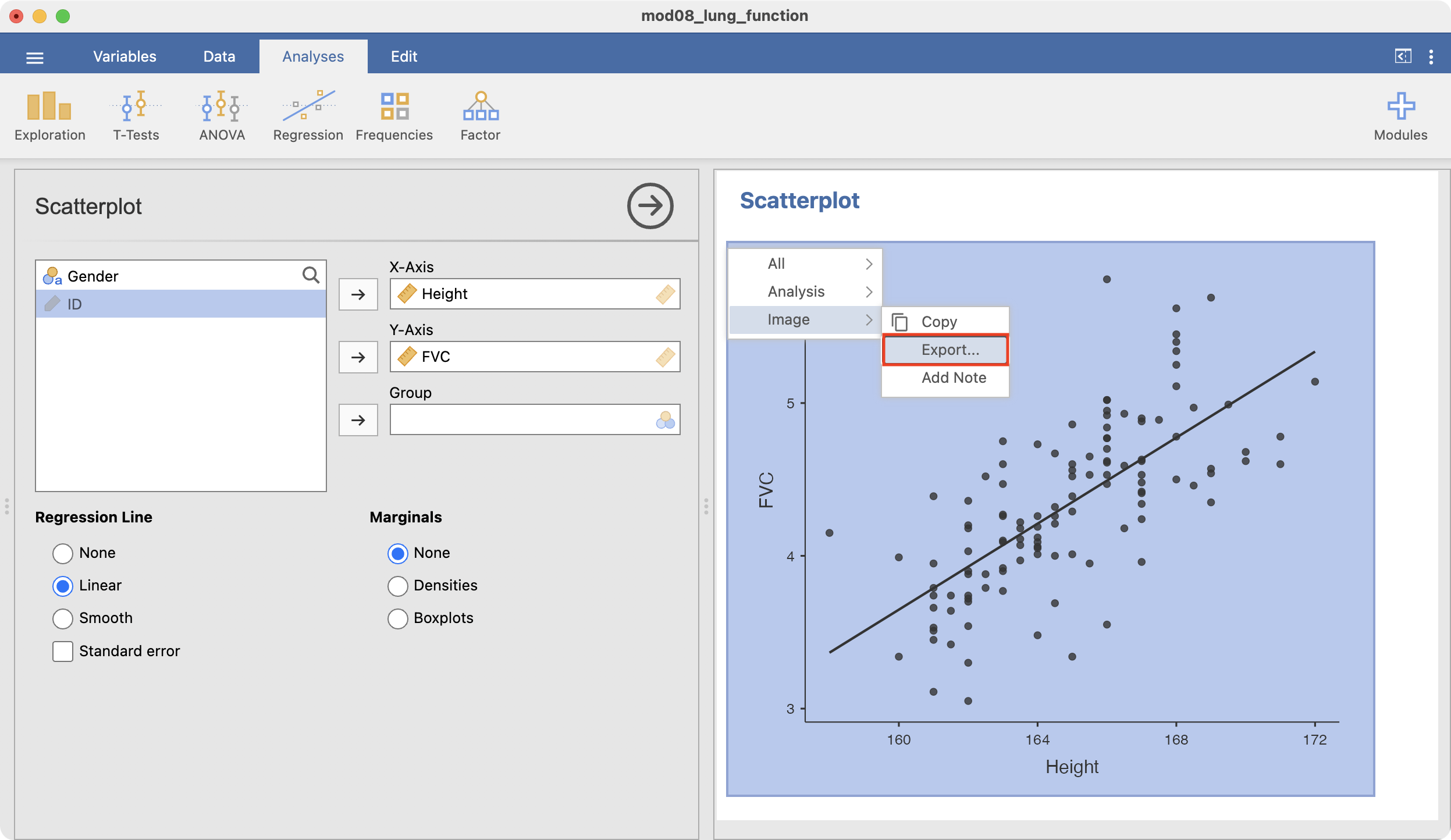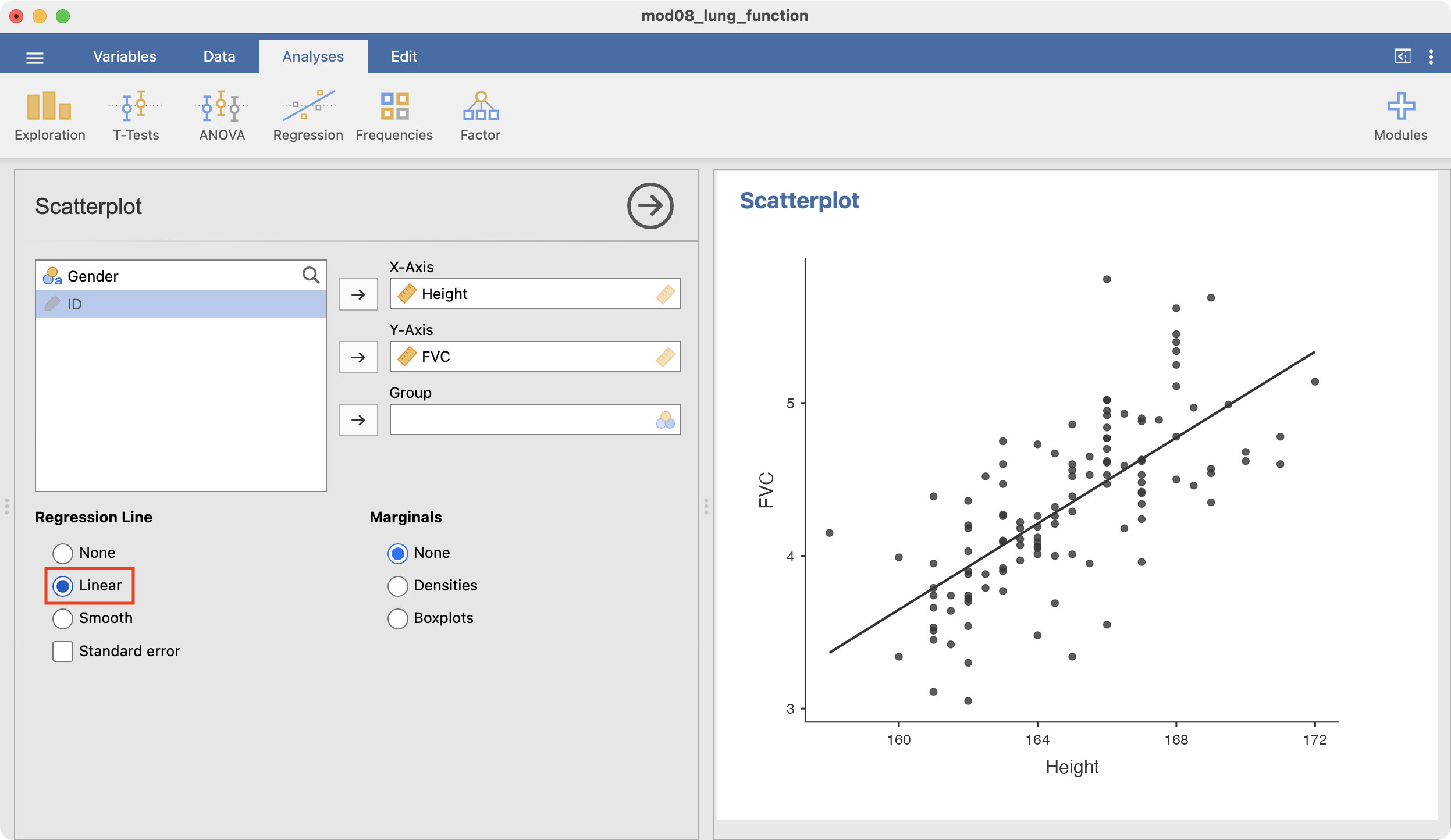 We will demonstrate using R for correlation and simple linear regression using the dataset mod08_lung_function.csv.
