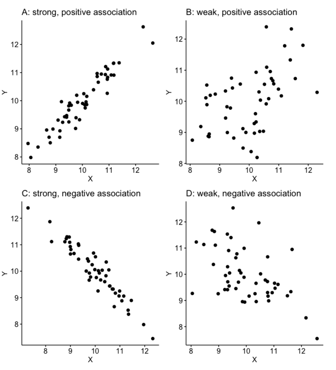 A correlation coefficient (r) describes how closely the variables are related, that is the strength of linear association between two continuous variables. The range of the coefficient is from +1 to −1 where +1 is a perfect positive association, 0 is no association and −1 is a perfect inverse association. In general, an absolute (disregarding the sign) r value below 0.3 indicates a weak association, 0.3 to < 0.6 is fair association, 0.6 to < 0.8 is a moderate association, and \(\ge\) 0.8 indicates a strong association.