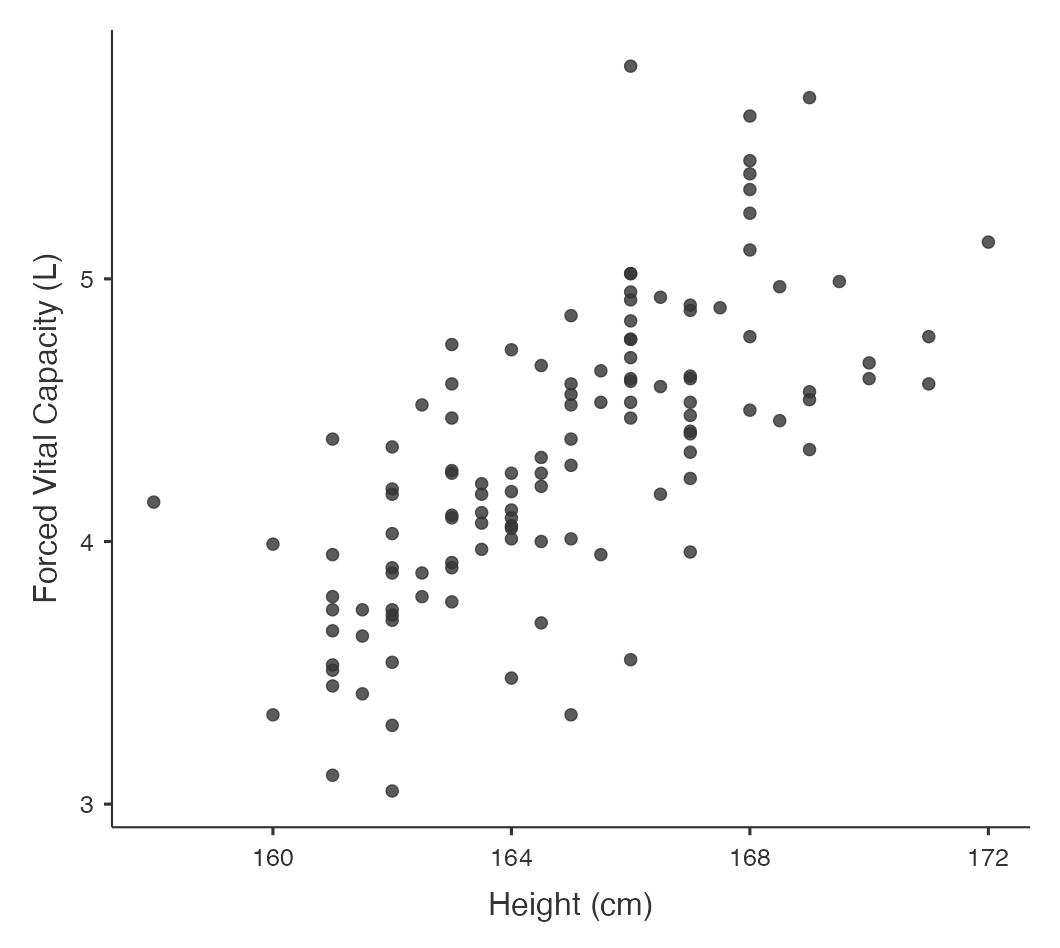 The file mod08_lung_function.csv has information about height and lung function collected from a random sample of 120 adults. Information was collected on height (cm) and lung function, which was measured as forced vital capacity (FVC), measured in litres. We can obtain a scatter-plot shown in Figure 8.1, where the outcome variable (\(y\)) is plotted on the vertical axis, and the explanatory variable (\(x\)) is plotted on the horizontal axis.